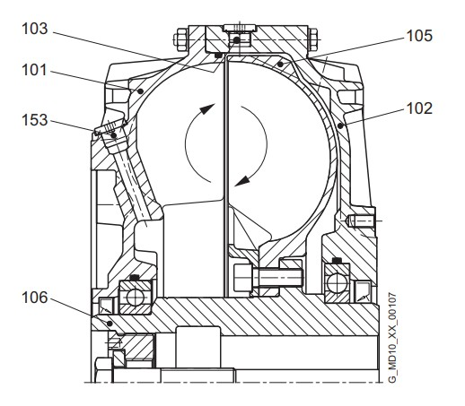 Los acoplamientos FLUDEX están construidos con pocos y robustos componentes. Los componentes internos incluyen el eje hueco o el eje macizo (106), al que se conecta la rueda de paletas (105). La carcasa exterior comprende la tapa (102) y el alojamiento de la rueda de paletas (101). La junta está construida como una junta de brida atornillada y sellada con una junta tórica. La carcasa exterior y el eje o eje hueco tienen doble soporte de rodamiento y están sellados hacia el exterior con retenes radiales. El acoplamiento está provisto de dos tapones de llenado (153) con protección integral contra el desbordamiento y de uno o dos tapones fusibles de seguridad (103) en la carcasa del acoplamiento para la protección contra el sobrecalentamiento. El tornillo de fusible o un tornillo de cierre colocado en la misma posición sirve también como tapón de vaciado del líquido y, con la ayuda de una escala marcada en la carcasa, puede utilizarse como indicador de nivel.
