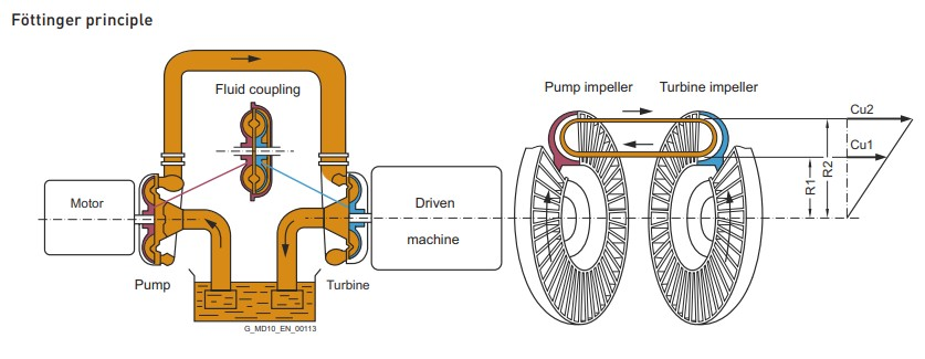 - Los acoplamientos FLUDEX son acoplamientos hidrodinámicos de fluidos que funcionan según el principio de Föttinger. Las piezas de acoplamiento de los lados de entrada y salida no están conectadas mecánicamente entre sí. La salida se transmite a través del relleno de aceite que gira en el acoplamiento y se conduce a través de paletas dispuestas radialmente.