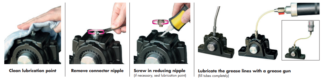 Antes de montar los lubricadores, es esencial limpiar los puntos de lubricación. Asegúrese de no introducir contaminantes en el rodamiento. La suciedad acorta la vida útil del rodamiento. Este paso es especialmente importante en caso de que los puntos de lubricación se encuentran en minas, consultas, plantas de cemento o asfalto. Cuando la suciedad es altamente abrasiva, puede acortar significativamente la vida útil del rodamiento.