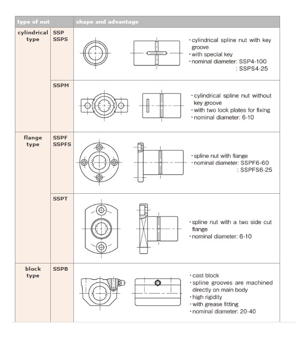 Spline shaft sizes with diameters from 4mm to 100mm are available. Several types of spline nuts are available: cylindrical types (SSP/SSPM), flange types (SSPF/SSPT ), and block types (SSPB). The material option of Stainless steel (SUS440C or equivalent) is also available. They can be specified to suit various applications.